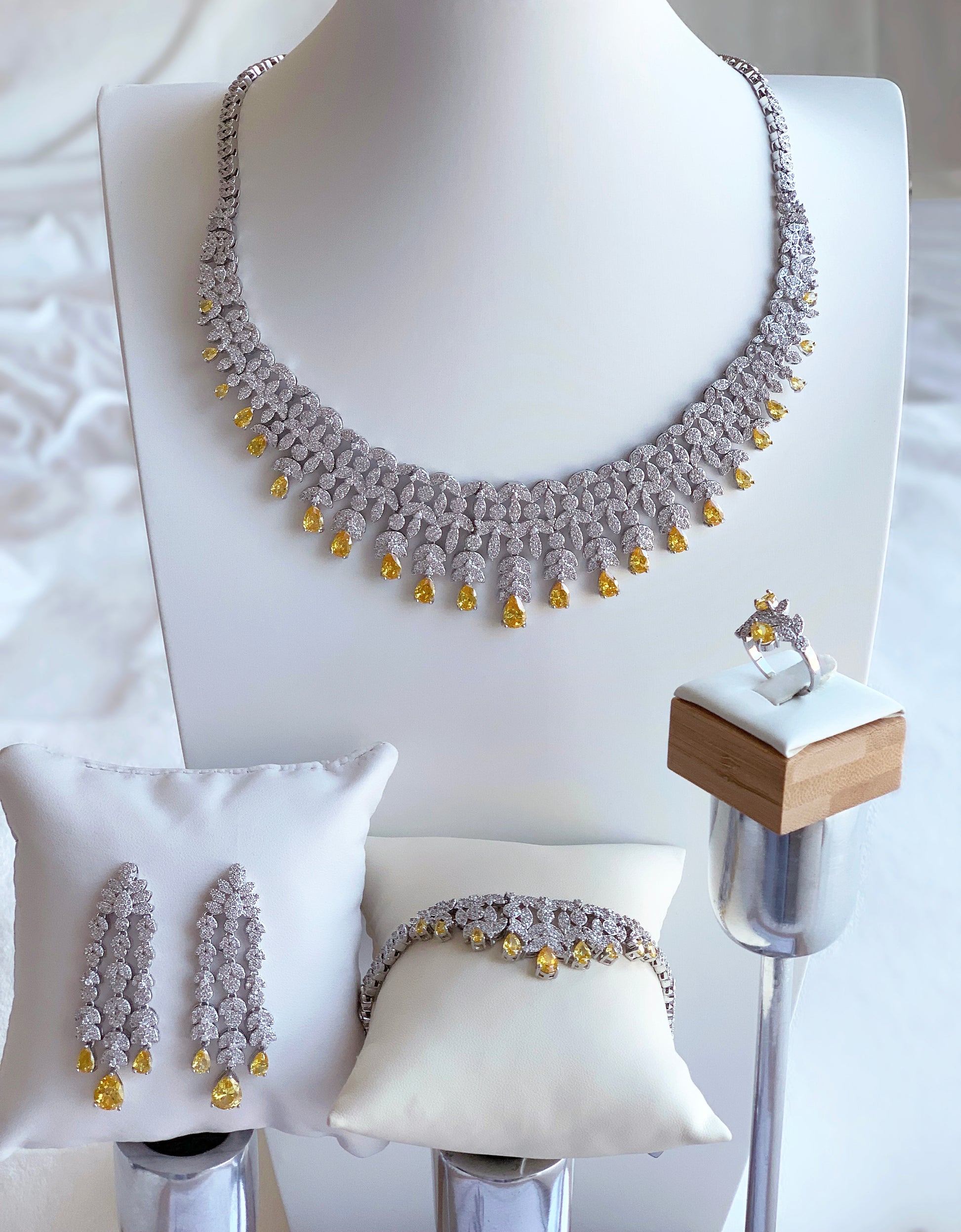 طقم مجوهرات فخم مكون من 4 قطع عقد ، أسوارة ، اقراط وخاتم