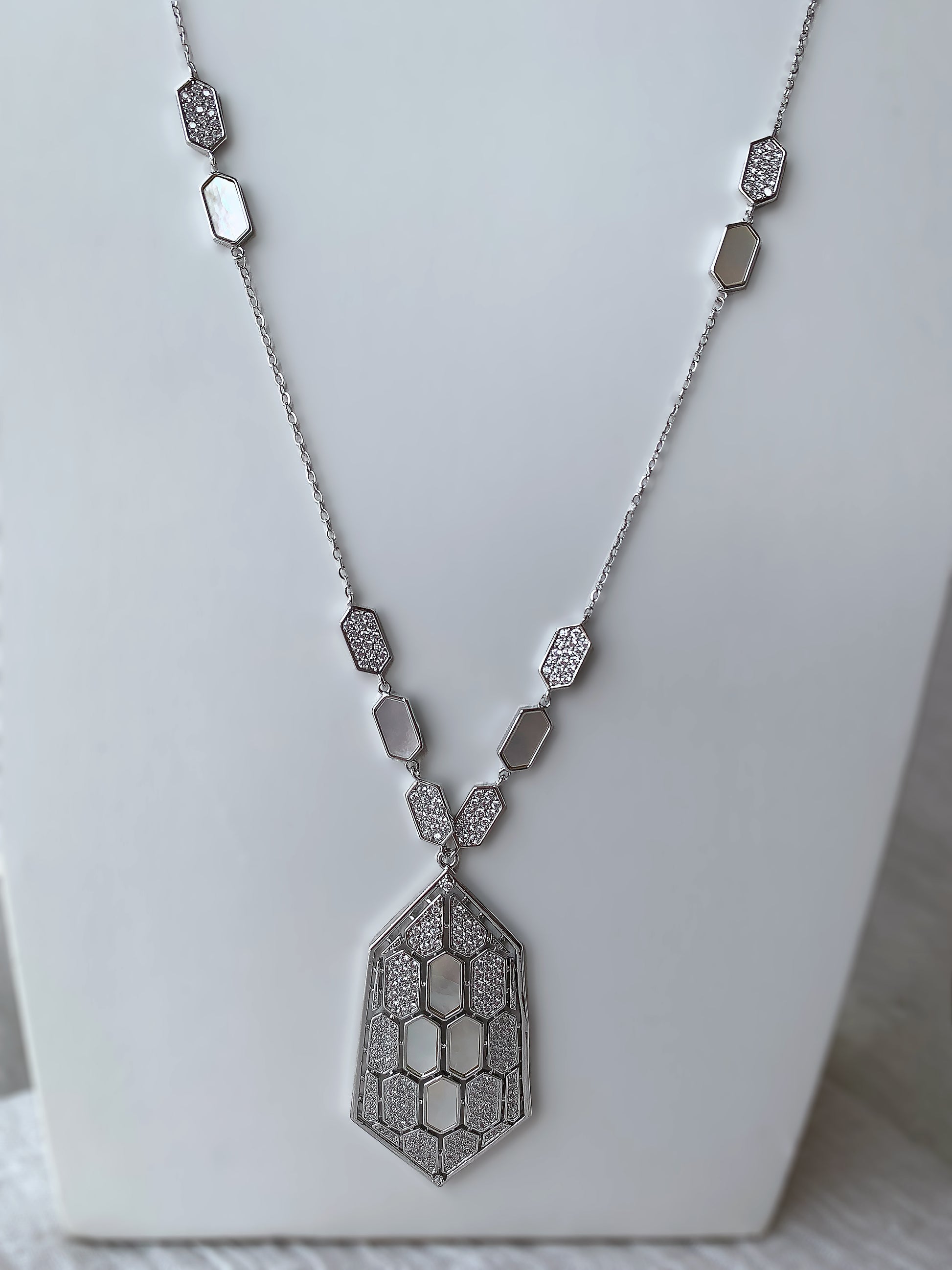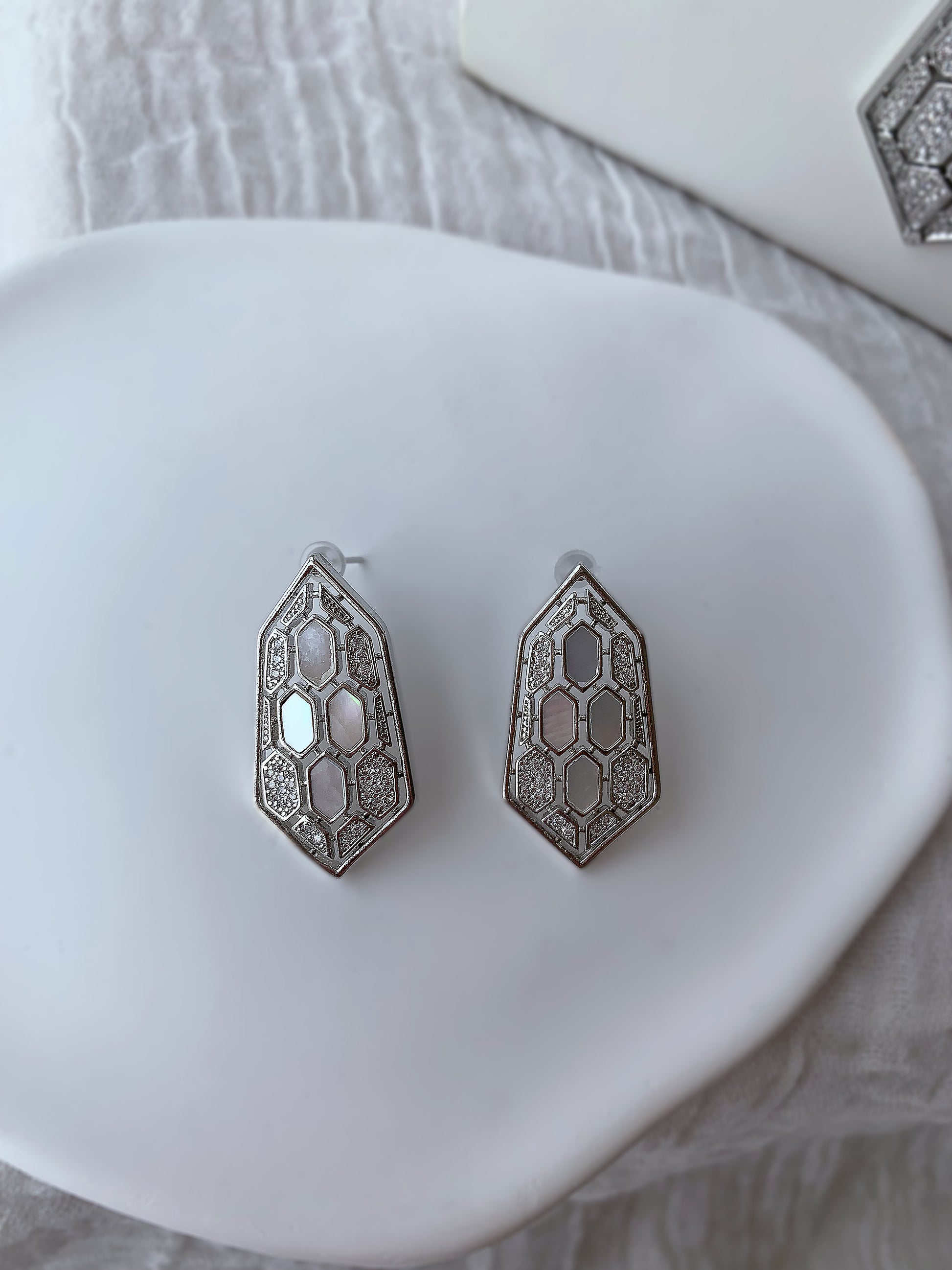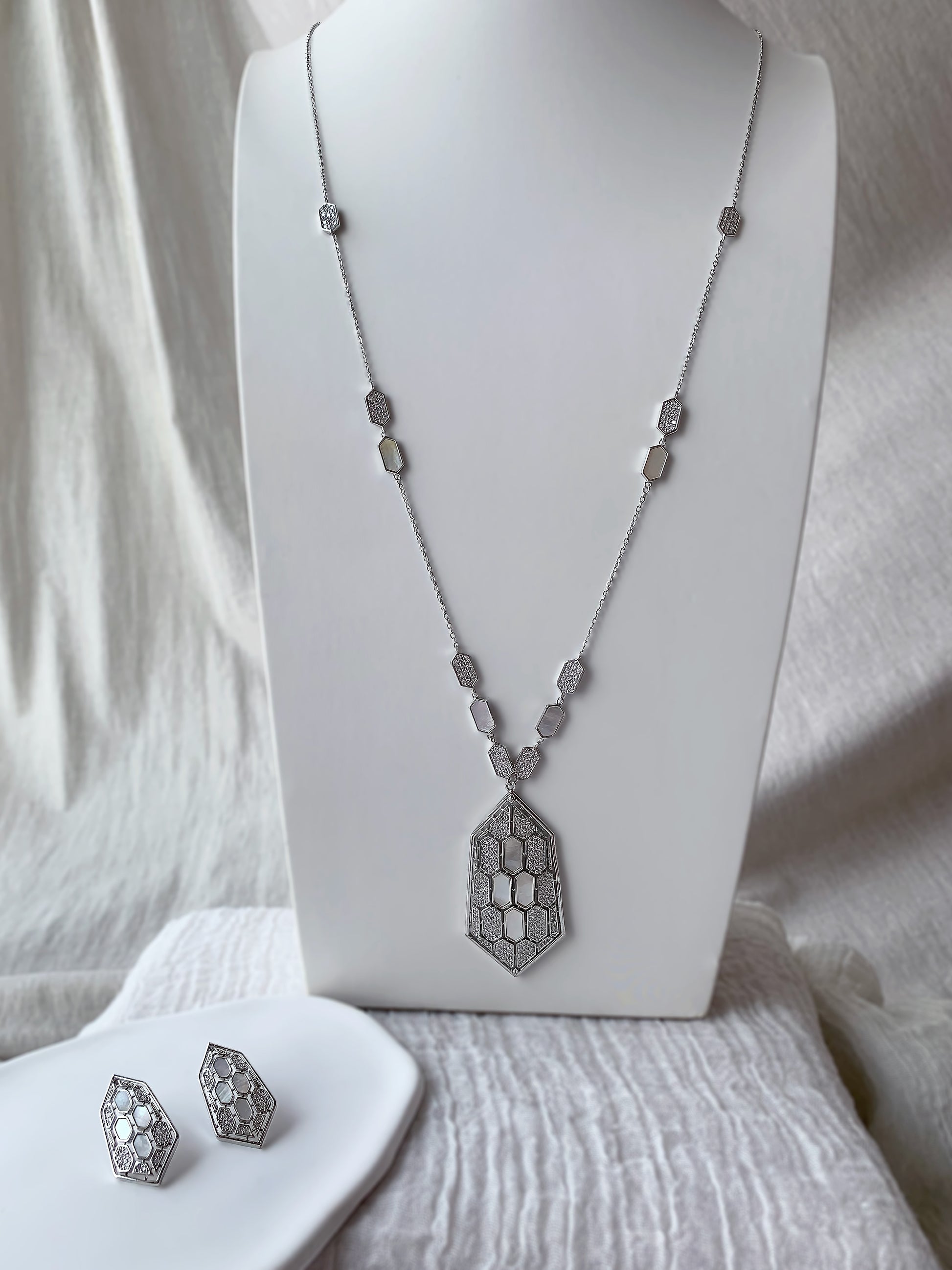 A refined jewelry set that blends modern geometry with timeless sparkle. This elegant design features delicate hexagon details inspired by honeycomb patterns, creating a sophisticated and eye-catching look.