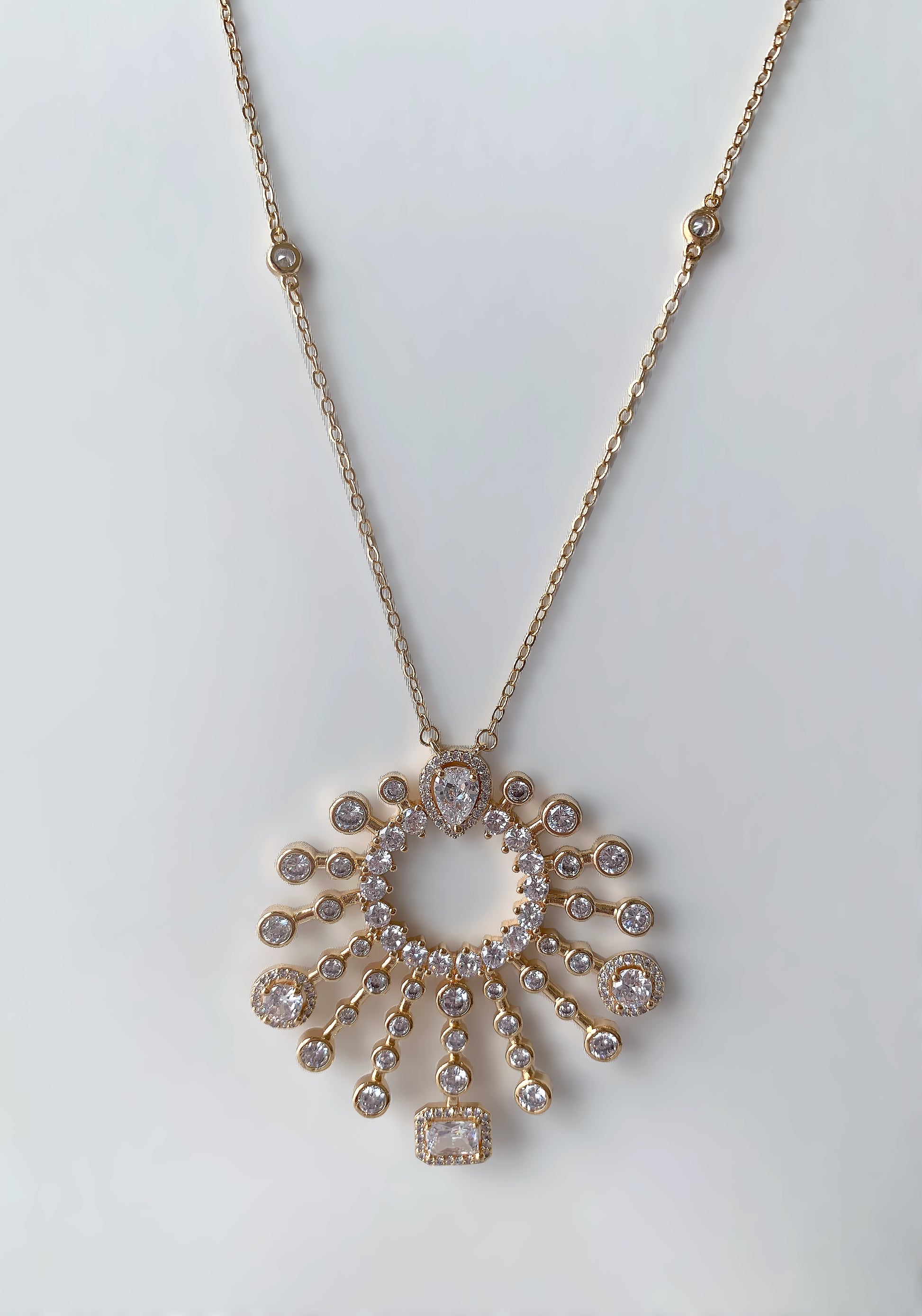 • Elegant sunburst-inspired pendant with radiant stone arrangement