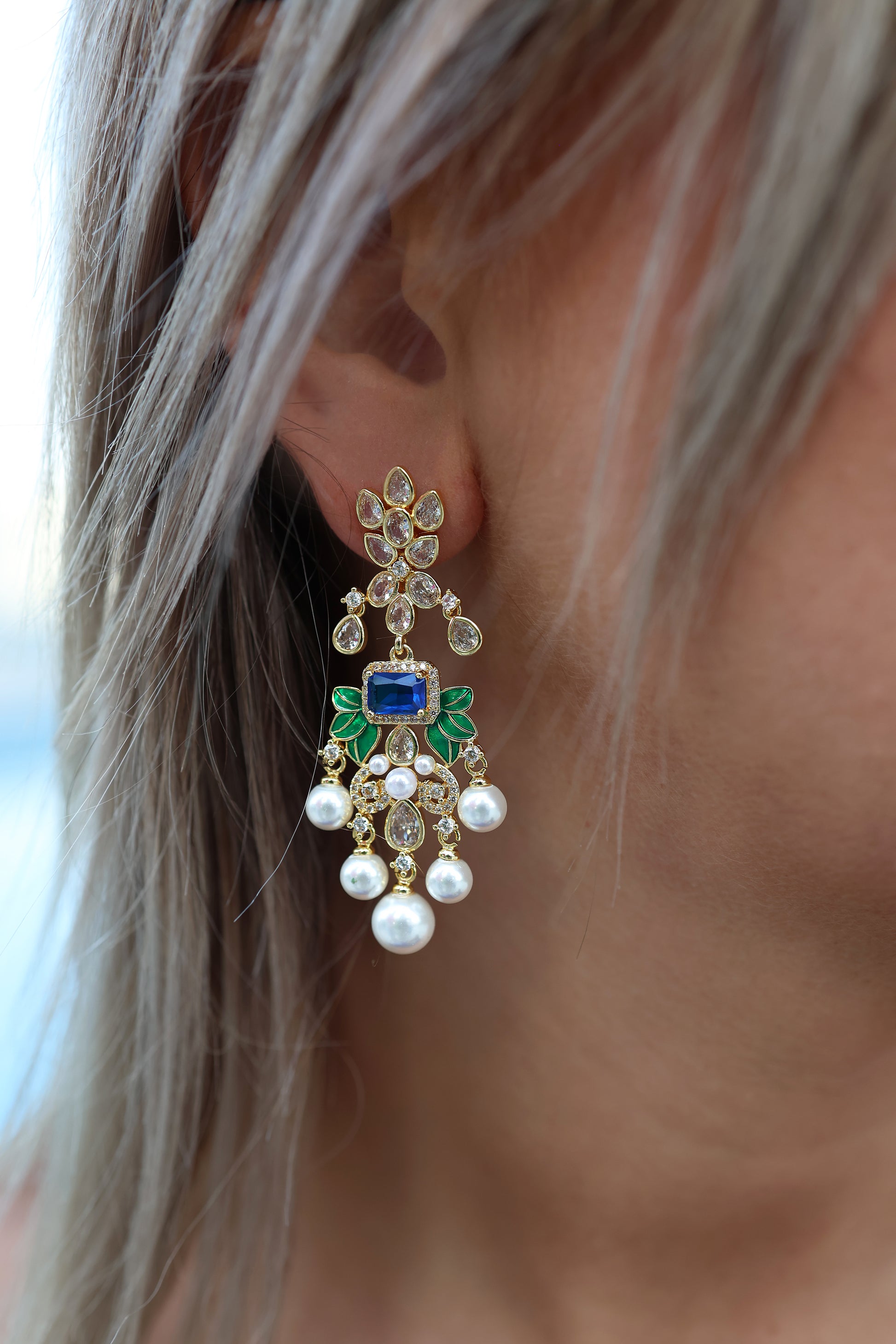 Inlaid in High Quality 5A+ Grade American Zircon Diamonds With Pearls and Blue Gemstones